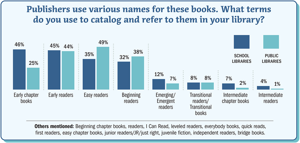 Worried that terms such as “easy” are a turnoff to children, 29 percent of school libraries and 23 percent of public libraries have changed their term for transitional books from “easy readers” to “early readers.” “Early chapter books” and “early readers” are the preference among 45–46 percent of school library respondents. “Easy readers” is still used by 49 percent of public libraries, with “early readers” used by 44 percent.