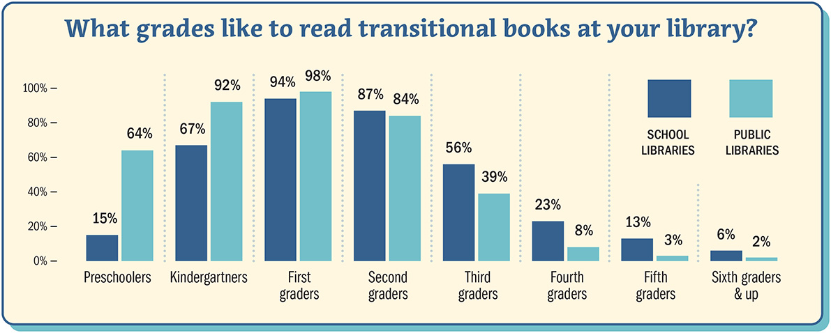 What makes a good transitional title? The 716 respondents—337 elementary/early school librarians and 379 public librarians—had varying opinions. But transitional books are a solid component of children’s book circulation, averaging about 21 percent in
