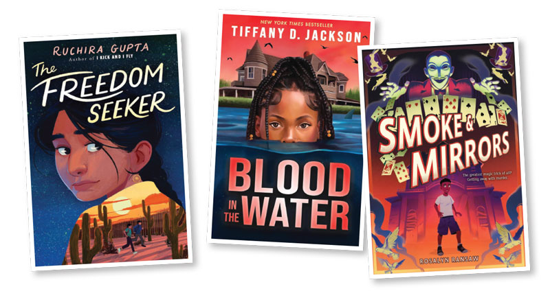 These three titles feature tweens with parents navigating incarceration and detention in the United States. Brooklyn-based Kaylani is trying to clear her incarcerated father’s name when a potential murder derails her summer in Tiffany D. Jackson’s Blood in the Water; Andy becomes embroiled in a small-town mystery while he awaits his father’s parole hearing in Rosalyn Ransaw’s Smoke & Mirrors; and Simi’s family makes a brave yet treacherous bid for asylum in the U.S. from India that results in their being separated and stranded across detention centers at the U.S.-Mexico border in Ruchira Gupta’s The Freedom Seeker.